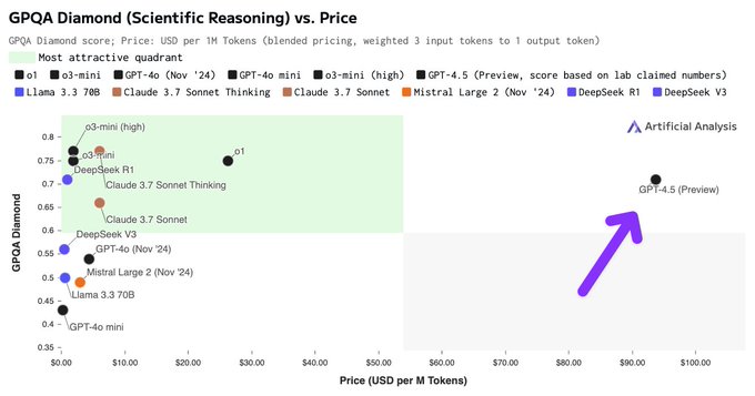 - In it, GPT 4.5 is >2x better than GPT-4o and 3% better than o1. Again, imagine this foundation in a reasoning model.